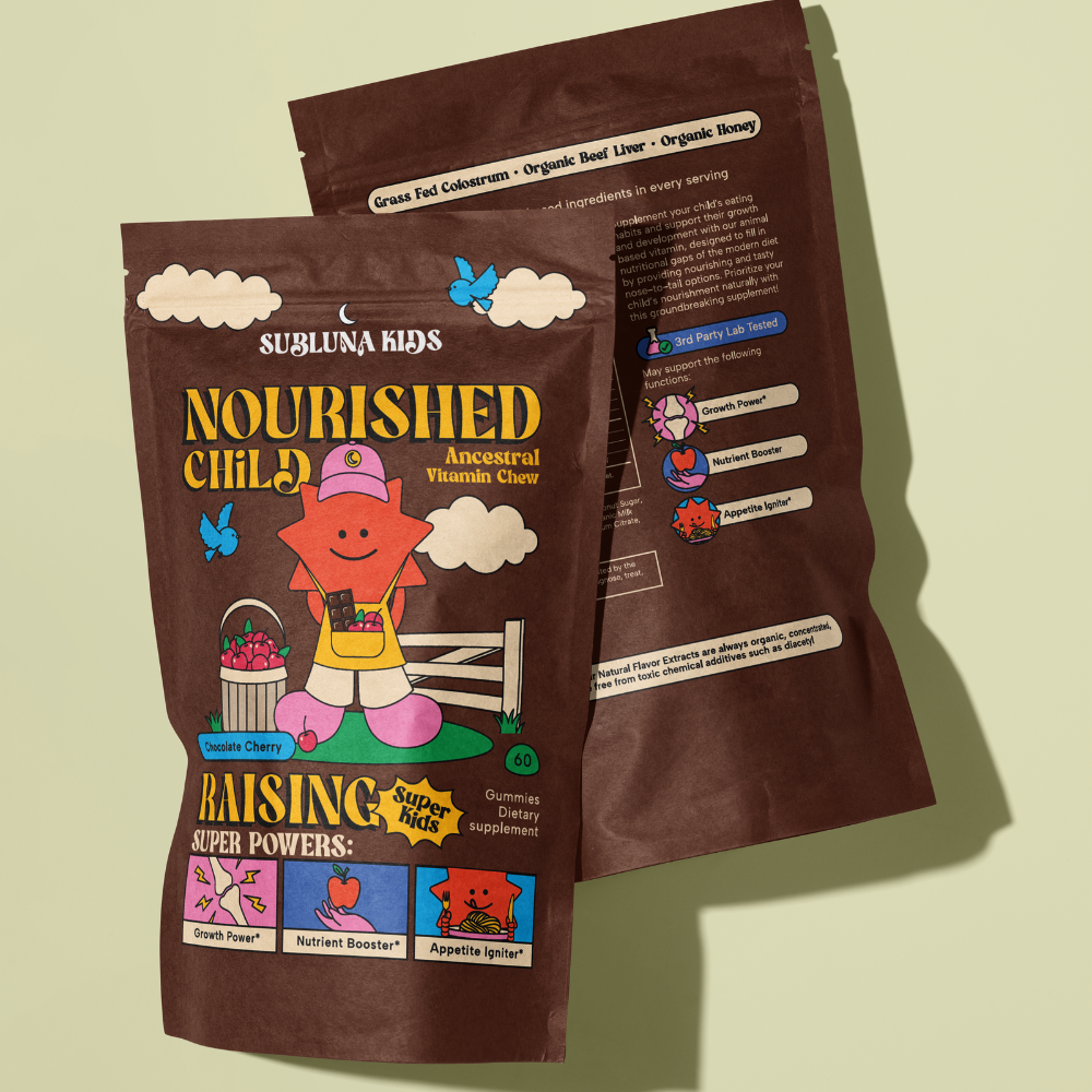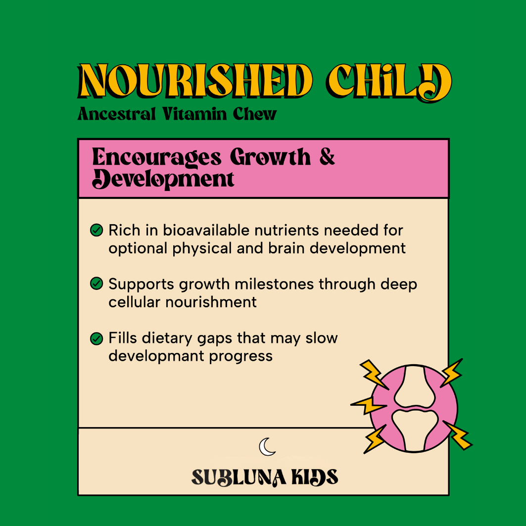 Nutritional deficiencies can be the root cause of a range of issues such as picky eating, slow growth & development, low immunity, moodiness, poor sleep, and behavioral challenges. Our animal gummy, packed with organic grass fed and finished beef liver, colostrum, ghee and bovine gelatin, offers a powerhouse of animal based nutrients in their most bioavailable forms, ensuring easy absorption and maximum benefits for your child's health.